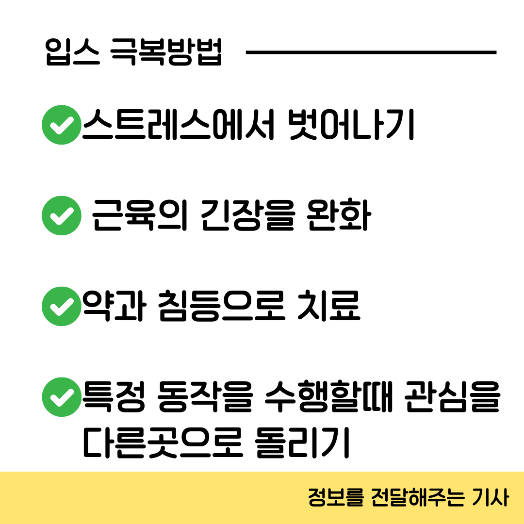 입스의 극복방법으로는 스트레스에서 벗어나는 것입니다. 스트레스로 인해 불안해지고 초조해지는 상황을 극복해야 합니다. 스윙연습을 더 한다고 나아지는 것이 아닌 휴식을 취하면서 잘해야 한다는 압박과 집착을 내려놔야 합니다.