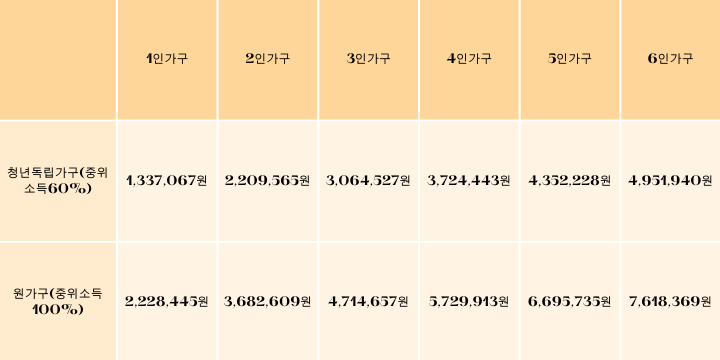 청년 독립 가구 소득이 기준 중위소득 60% 이하 (1인 기준 월 1,337,067원 이하)