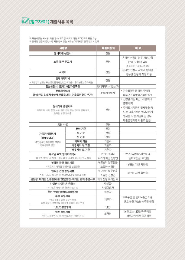 제출서류에는 월세지원 신청서, 소득재산 신고서, 서약서와 임대차 계약서 등이 있으므로 꼭 확인하고 제출하시길 바랍니다.